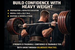 Confidence with heavy weight grows through preparation, repeated execution, and consistent exposure to demanding lifts....