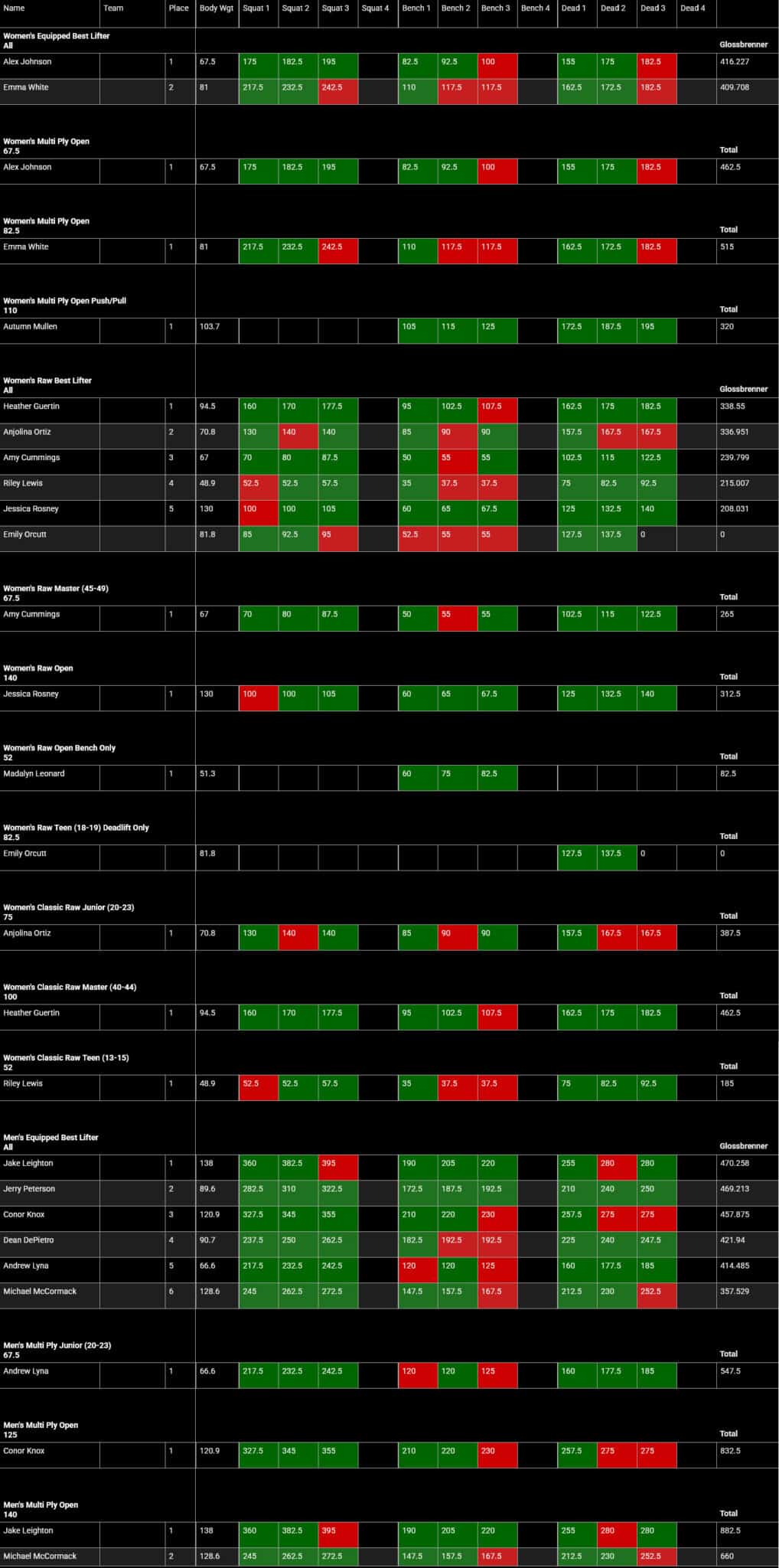 The best Glossbrenner score (which determines the best lifter relative to bodyweight) and the heaviest overall total of the meet at 1,945.5 pounds belonged to Jake Leighton. Competing at over 300 pounds bodyweight, Leighton separated himself from the field with consistently strong lifts across all three disciplines, making his performance the most dominant.